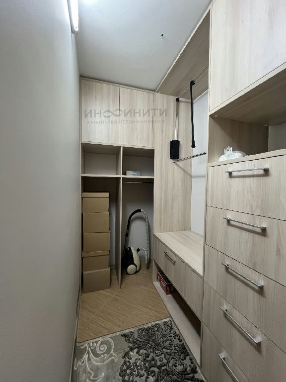 В квартире спроектирована удобная гардеробная с встроенными шкафами, дверцы с доводчиками.