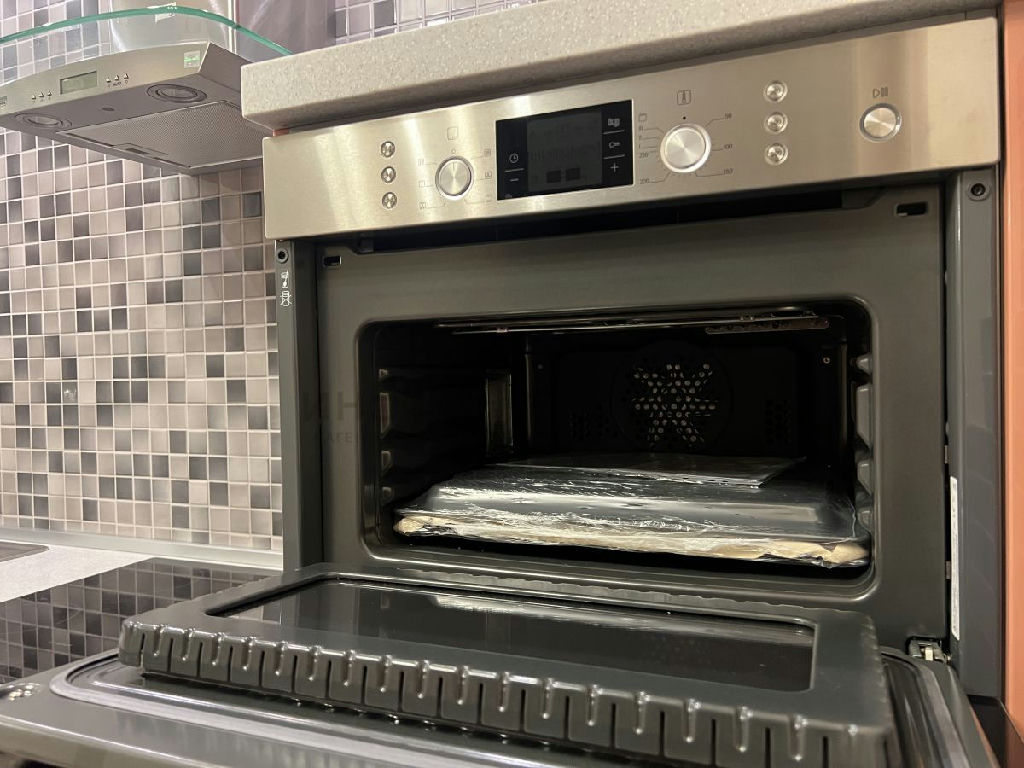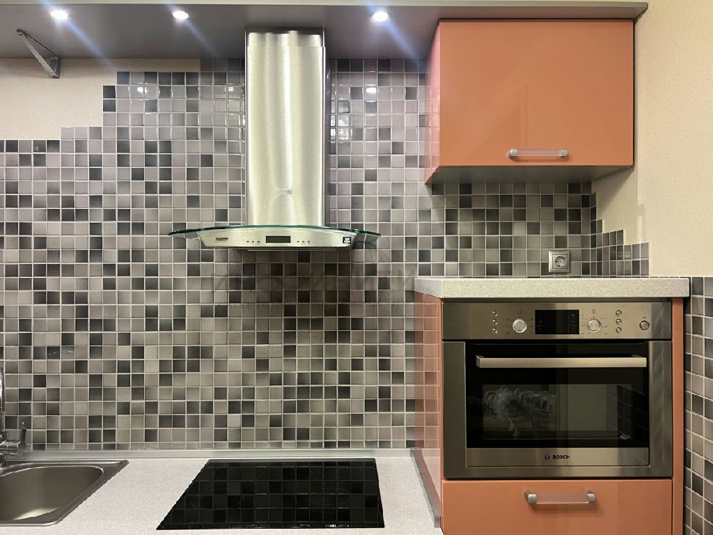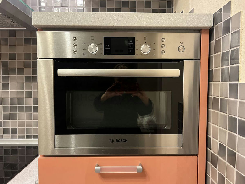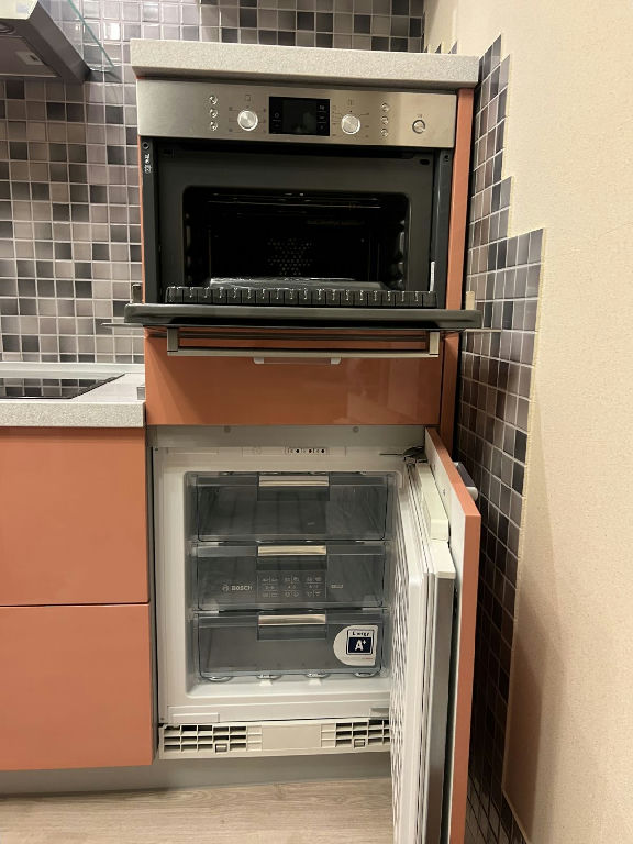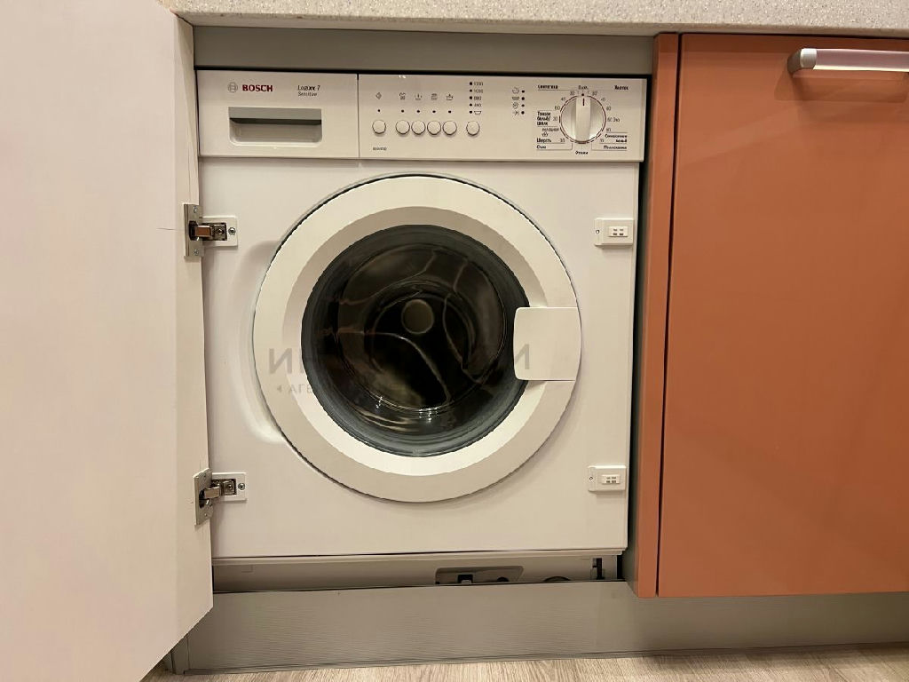 На просторной кухне вся встроенная техника компании BOSH: это - духовой шкаф, посудомоечная машина, морозильная камера, стиральная машина, кондиционер.